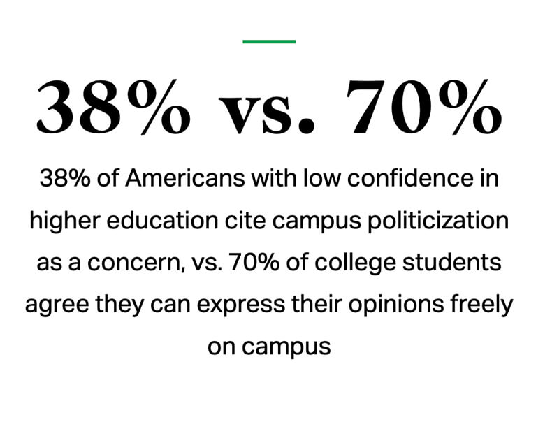 Although significant partisan gaps in confidence persist among adults, such differences are not observed among students themselves. Three-quarters of graduates say their degree was important to their career success, and most recent bachelor’s degree graduates secured a good job within a year of graduation. Cost remains a top concern, yet the majority of students and alumni continue to view a college degree as worth the investment.